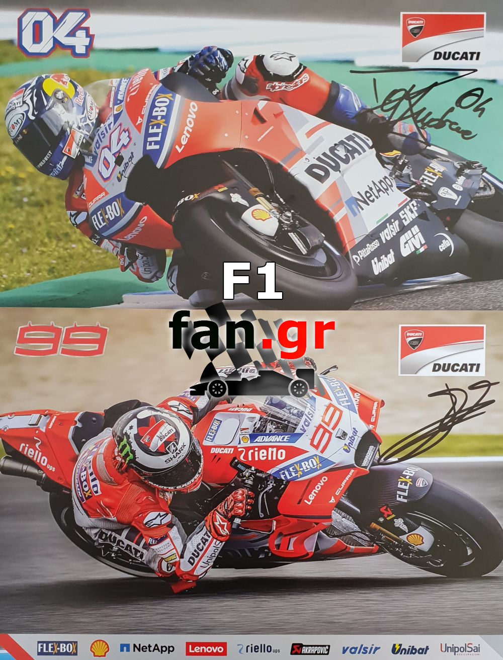 Το F1fan.gr εξασφάλισε υπογεγραμμένα poster των δύο αναβατών της Ducati Team, Andrea Dovizioso και Jorge Lorenzo (παρά την μετακίνηση του στη Honda το 2019), και τα διαθέτουμε στους επισκέπτες μας.