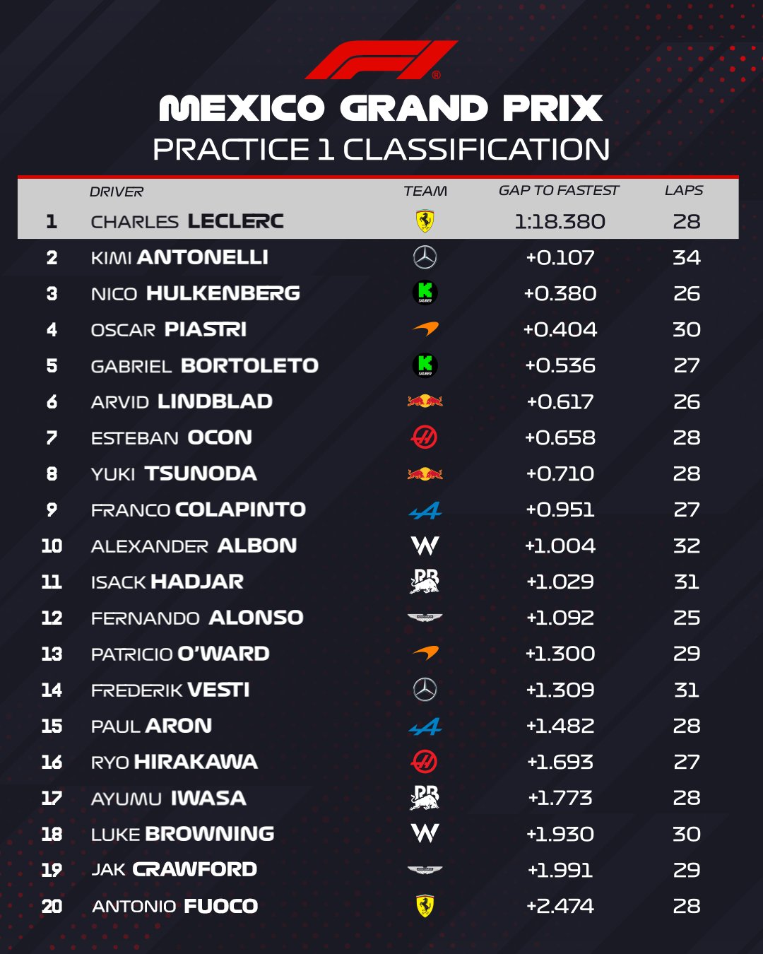 Ο Charles Leclerc τερμάτισε πρώτος στην 1η διαδικασία ελεύθερων δοκιμών για το Grand Prix της Πόλης του Μεξικού, με τον οδηγό της Ferrari να προηγείται των Kimi Antonelli και Nico Hulkenberg.